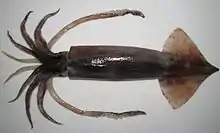 | Toutenon Ordre : Oegopsides Famille : Ommastrephidae Espèces consommées : Todarodes angolensis, T. filipovae, T. pacificus, T. sagittatus, Todaropsis eblanae | ![]() Todarodes pacificus | |