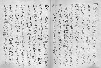 - Meigetsuki (明月記) (« Le document de la claire Lune », parfois appelé le « Journal de la claire Lune »[75] ou peut-être « Chronique de la Lune brillante »[76]). Comme le suggère la seconde traduction, il s'agit d'un journal que Teika a tenu en chinois classique entre les âges d'environ 18 ans (en 1180) juste avant sa mort, autour de 1241 ; les entrées pour 1180 et 1181 peuvent avoir été écrites lorsque Teika était un vieil homme[77] mais la majeure partie de l'agenda couvre les 47 années entre 1188 et 1235. Comme son exhaustivité peut le suggérer, c'est une ressource extrêmement précieuse pour la compréhension de la cour et la place de Teika à la cour impériale, même en dépit de l'incomplétude des versions existantes disponibles. Elle se compose de 56 parchemins (la famille Reizei possède dans la bibliothèque familiale des holographes des 56 et des copies de deux autres encore) tandis que les chercheurs estiment que l'original est composé de plus de 180 rouleaux.) Parmi ses nombreux passages intéressants (certaines cités précédemment) au sujet de la carrière et la vie de Teika est un passage célèbre du neuvième mois de 1180 à propos de l'indifférence de Teika à l'avancement politique ou militaire, dans lequel il fait aristocratiquement remarquer que « les rapports des perturbations et des expéditions punitives remplissent les oreilles mais je n'y fais aucune attention. les bannières rouges et les expéditions contre les traîtres ne sont pas de mes préoccupations » (ici, « bannières rouges » se réfère probablement à l'étendard impérial ; la dernière ligne est peut-être une référence à un poème de Bai Juyi dans lequel il raconte comment il a été effectivement en exil et passé son temps à jouer au jeu de go).