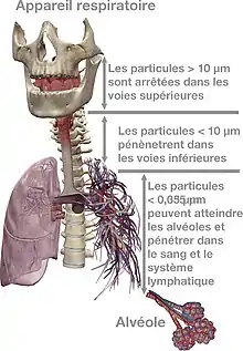Bien que la taille des particules ainsi aérosolisées varie entre plus de 200 micromètres (ou microns) et moins 0,01 micromètre, leur taille moyenne fait qu'une part très importante de ces particules est susceptible d'atteindre les alvéoles pulmonaires (70% des particules ont une taille inférieure à 0.3μm). D’après les résultats des études expérimentales, leur taille fait que ces particules inhalées sont donc capables de traverser la paroi alvéolaire, migrer vers la plèvre, les structures ganglionnaires, rejoindre les systèmes sanguin et lymphatique et ainsi atteindre différents organes comme le foie, le cœur ou la rate.