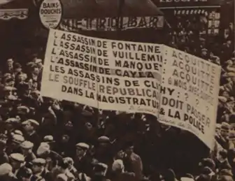 Le préfet de police Roger Langeron autorise un défilé et les forces de l'ordre sont mobilisées pour protéger la réunion, et partant, la liberté de réunion. Le cortège s'éloigne du cinéma dans un premier temps mais des incidents, à l'origine mal déterminée, mettent aux prises contre-manifestants et forces de l'ordre tandis que les membres du PSF sont exfiltrés du cinéma. Des premiers coups de feu sont tirés. La foule les entendant se presse vers le lieu de l'incident et prend à partie les renforts de police, qui ouvrent le feu contre les contre-manifestants, dans une confusion certaine[7],[6].
