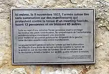Une rencontre a lieu chaque année auprès du monument, à la mémoire des victimes. Un « Comité du 9 novembre 1932 » réunit la gauche genevoise, les milieux syndicaux, anti-fascistes et anti-militaristes (coordonné depuis 2001 par le secrétariat de la Communauté genevoise d’action syndicale)[30]. Des manifestations plus larges sont organisées lors des années anniversaires.
