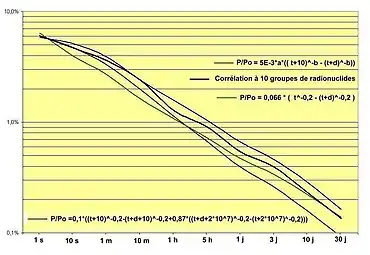 Immédiatement après l'arrêt des réactions de fission, un réacteur nucléaire dégage toujours environ 7 % de sa puissance thermique nominale[2], cette puissance résiduelle diminue de façon logarithmique[3]. Elle est ainsi proche de 2 % de la puissance nominale une demi heure après l'arrêt et de 1 % de la puissance nominale huit heures après l'arrêt.