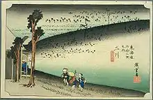 L'estampe classique ukiyoe d'Ando Hiroshige (édition Hoeido) de 1831-1834 montre un paysage assez désolé avec des personnages à l'air fatigué s'approchant d'une maison de thé isolée[2].