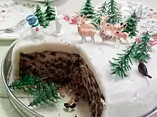Le gâteau de Noël est une tradition anglaise qui a débuté sous la forme d'un porridge aux prunes[1]. Le gâteau de Noël anglais traditionnel est composé de raisins de Corinthe, de raisins secs (dorés) et de raisins secs trempés dans du brandy, du rhum, du whisky ou du xérès. Le gâteau peut être recouvert de couches de massepain, puis de glaçage et est généralement décoré, souvent avec des bandes de ruban écossais et des figures de Noël tels que des bonshommes de neige, des sapins ou le Père Noël.