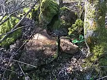 - Une stèle de pierre informe, aujourd’hui couchée sur le flanc de la butte, parait à plusieurs reprises avoir marqué l’emplacement de la sépulture