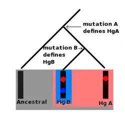 En outre les dix hommes qui portent le chromosome avec la mutation A sont les descendants directs en ligne masculine du même homme qui fut le premier à porter la mutation. Le premier homme qui porta la mutation B fut aussi un descendant direct en ligne masculine de cet homme, mais est aussi ancêtre direct masculin de tous les hommes portant la mutation B. Des séries de mutations forment des lignages moléculaires. En plus chaque mutation SNP peut définir un ensemble de chromosomes Y spécifiques qu'on appelle haplogroupe.
