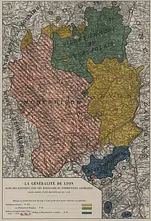 La généralité de Lyon comportait un nombre de bourgs, de villages et de villes très important[1]. La généralité est à la fois une circonscription judiciaire et financière. Sur le plan judiciaire, la généralité de Lyon est rattachée au Parlement de Paris. Les Intendants se heurtent au pouvoir des gouverneurs, mais aussi du Prévôt des Marchands et à l'archevêque.