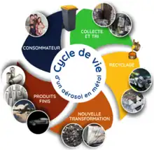 - Les consommateurs : Grâce au bon geste de tri du consommateur, le générateur d’aérosols métallique sera jeté dans les poubelles réservées aux emballages ménagers[10].