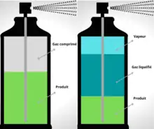 Les générateurs d’aérosols utilisant du gaz liquéfié présentent trois strates. En bas, le produit actif, au-dessus le gaz liquéfié et plus haut, le gaz propulseur. La pression sur le diffuseur entraine l’expulsion du gaz propulseur avec le produit. D’autres technologies avec du gaz comprimé non soluble existent et font appel à une valve à poche.
