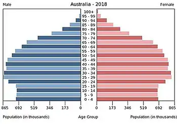 L'indice synthétique de fécondité de l'Australie est passé de plus de trois dans l'après-guerre, à environ le niveau de remplacement (2,1) dans les années 1970, à moins de ce niveau à la fin des années 2010. Il s'est établi à 1,74 en 2017. Cependant, l'immigration a compensé les effets de la baisse de la natalité. Dans les années 2010, parmi les résidents de l'Australie, 5 % sont nés au Royaume-Uni, 2,5 % de Chine, 2,2 % d'Inde et 1,1 % des Philippines. 84 % des nouveaux arrivants au cours de l'exercice 2016 avaient moins de 40 ans, contre 54 % des personnes déjà présentes dans le pays. Comme d'autres pays favorables aux immigrants, tels que le Canada, le Royaume-Uni et les États-Unis, la population australienne en âge de travailler devrait croître jusqu'en 2025 environ. Toutefois, le rapport entre les personnes en âge de travailler et les personnes à charge et les retraités (le ratio de dépendance démographique) est passé de huit dans les années 1970 à environ quatre dans les années 2010. Il pourrait tomber à deux dans les années 2060, en fonction des niveaux d'immigration[100]. « Plus la population est âgée, plus il y a de personnes qui bénéficient de prestations sociales, nous avons besoin de plus de soins de santé, et il y a une base plus petite pour payer les impôts », a déclaré Ian Harper de la Melbourne Business School à ABC News (Australie)[101]. Alors que le gouvernement a revu à la baisse ses projets de relèvement de l'âge de la retraite, de réduction des pensions et d'augmentation des impôts en raison de l'opposition de l'opinion publique, les pressions démographiques continuent de s'accentuer, alors que les effets tampons de l'immigration s'estompent[100]. Les Australiens qui arrivent à l'âge adulte au début du XXIe siècle sont plus réticents à avoir des enfants que leurs prédécesseurs pour des raisons économiques : dette étudiante plus élevée, logement coûteux et croissance négative des revenus[101].