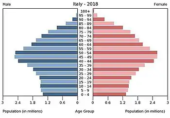 Le taux de fécondité en Italie est passé d'environ quatre dans les années 1960 à 1,2 dans les années 2010. Ce n'est pas parce que les jeunes Italiens ne veulent pas procréer. En effet, avoir beaucoup d'enfants est un idéal italien. Mais son économie bat de l'aile depuis la grande récession de 2007-8, et le taux de chômage des jeunes atteint le chiffre vertigineux de 35 % en 2019. De nombreux Italiens ont déménagé à l'étranger - 150 000 l'ont fait en 2018 - et beaucoup sont des jeunes à la recherche d'opportunités éducatives et économiques. Avec le plongeon du nombre de naissances chaque année, la population italienne devrait diminuer dans les cinq prochaines années[55]. L'ISTAT a indiqué que le nombre de bébés nés en 2018 en Italie était le plus faible depuis l'unification de l'Italie en 1861[31]. En outre, les baby-boomers sont nombreux à prendre leur retraite et leur nombre éclipse celui des jeunes qui s'occupent d'eux. Seul le Japon a une structure d'âge plus orientée vers les personnes âgées[55]. En 2018, 23 % de la population italienne était âgée de plus de 65 ans, contre 27 % au Japon[13]. Un moyen d'inciter à la reproduction serait, comme l'a fait la France, d'investir dans des congés parentaux plus longs, des garderies et des exonérations fiscales pour les parents. En 2019, la France a approximativement la même population que l'Italie, mais 65 % de naissances en plus[55]. En 2015, l'Italie a introduit une aide financière de 800 € par couple et par enfant. Cette mesure ne semble pas avoir eu d'impact sur le long terme. Les gens peuvent choisir d'avoir un enfant plus tôt, mais finalement, cela n'augmente pas le taux de fécondité de la nation. Ce schéma a également été observé dans d'autres pays, a déclaré à la BBC Anne Gauthier, experte en études familiales de l'Université de Groningue. Dans le cas de l'Italie, la subvention ne répond pas aux préoccupations économiques ou aux attitudes sociales[56]. Un autre moyen est l'immigration, qui a atténué le déclin, mais qui ne va pas sans contrecoup politique[55].
