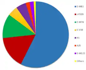 Les différents auteurs attribuent à l'haplogroupe J1, sous-groupe de J, que l'on trouve surtout dans l'Afrique de l'Est et en plus grand nombre dans la péninsule Arabique, et dont la fréquence dépasse parfois les 20 % dans certaines régions du Maghreb, en Libye surtout, une origine soit néolithique soit plus récente et due aux conquêtes arabes[19]. L'haplogroupe R1b (M269), présent surtout en Europe de l'Ouest arrive ensuite avec des fréquences entre 0 et 15 % selon les régions. Les principaux haplogroupes du chromosome Y des populations de l'Afrique du Nord berbérophones et arabophones sont : E1b1b1b (M81) et J1 (M267).