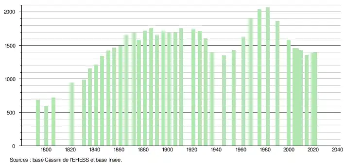 L'évolution du nombre d'habitants est connue à travers les recensements de la population effectués dans la commune depuis 1793. Pour les communes de moins de 10 000 habitants, une enquête de recensement portant sur toute la population est réalisée tous les cinq ans, les populations légales des années intermédiaires étant quant à elles estimées par interpolation ou extrapolation[18]. Pour la commune, le premier recensement exhaustif entrant dans le cadre du nouveau dispositif a été réalisé en 2004[19].