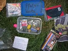 Certaines caches peuvent receler un (ou plusieurs) objets : objets voyageurs (travel bug), géomonnaie, Goodies, ...