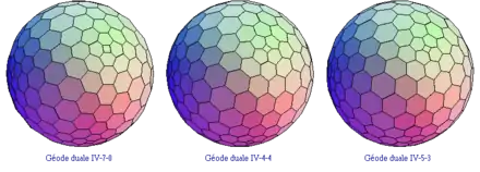 - de même, les hexagones obtenus dans la construction des géodes duales paraissent être réguliers mais ils ne le sont généralement pas (toutefois ils le sont lorsque a = b = 1, quel que soit N) ;