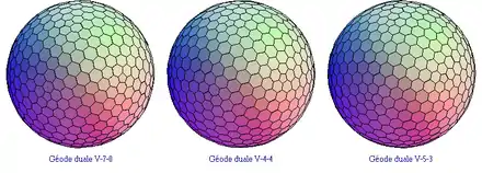 - Si au lieu de la géode normale, on souhaite construire la géode duale correspondante, il faut déterminer sur la sphère (S) le centre de chacun de ces triangles sphériques (qui sont donc « en face » des centres des faces de la géode V-a-b normale,) et si les points-centres ainsi obtenus correspondent à des faces adjacentes de la géode normale, on doit joindre ces points deux à deux pour former les arêtes de la géode duale. L'ensemble de ces arêtes dessinent des polygones qui sont les faces de la géode duale ; ces faces sont des hexagones, sauf douze d'entre elles qui sont des pentagones réguliers dont les centres sont situés « en face » des douze sommets du polyèdre générateur (R).