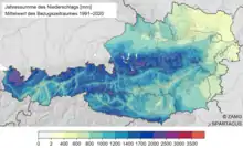 Pour l'ensemble de l'Autriche, la moyenne des précipitations se monte à 1 100 mm/an. Le semestre d'été (avril à septembre) enregistre 60 % du volume annuel, ce qui est favorable à la flore. Pour la plupart des régions, le mis le plus pluvieux est, de faut de la convection atmosphérique juin ou juillet, avec pour seule exception la vallée de la Lesachtal en Carinthie : de par l'influence méditerranéenne, le maximum de précipitations survient en octobre.