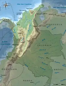 La Colombie est un pays situé dans le coin nord-ouest de l'Amérique du Sud. Dans le sens des aiguilles d'une montre, en commençant par le nord, il est entouré par la mer des Caraïbes (mer bordière de l'océan Atlantique nord), le Venezuela, le Brésil, le Pérou, l'Équateur, l'océan Pacifique nord et le Panama, qui le relie à l'Amérique centrale. Bogota en est la capitale.