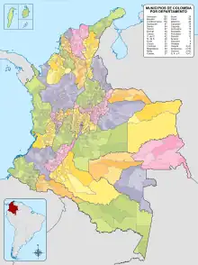 Selon la Constitution de 1991, la Colombie est divisée en 32 départements et un unique distrito capital, Bogota. L'échelon inférieur est constitué d'approximativement 1 123 municipios dont font partie le distrito capital et les districts spéciaux de Barranquilla, Cartagena, Santa Marta et Buenaventura.