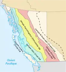 Les domaines orogéniques de la Colombie-Britannique sont les suivants (de l'est vers l'ouest)[1] :