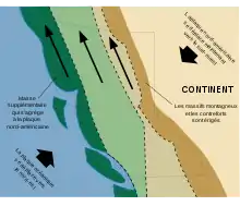 Plusieurs millions d'années plus tard, la mer intérieure a totalement disparu. Le mouvement des plaques change de sens. La plaque nord-américaine se déplace vers le sud-est, tandis que la plaque océanique se déplace vers le nord-ouest. Ce changement de direction permet l'accrétion de l'île de Vancouver il y a 60 millions d'années.