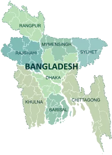 Depuis septembre 2015, le Bangladesh est composé de huit divisions (bibhags, বিভাগ) qui portent chacune le nom de leur capitale, Barisal, Chittagong, Dhâkâ, Khulna, Mymensingh, Râjshâhî, Rangpur, Sylhet.