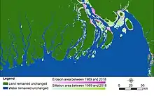 Les zones côtières du Bangladesh couvrent la partie sud du Bangladesh. Les principaux fleuves du Bangladesh provenant de l'Himalaya transportent un niveau élevé de sédiments et le déposent à travers le golfe du Bengale. Cela a conduit à des changements majeurs dans la région côtière entre 1989 et 2018. En 30 ans de changements morphologiques, de nombreuses îles ont perdu de la superficie terrestre. Cependant, il y a eu un gain net global de superficie terrestre en raison du processus d'accélération régulier dans d'autres parties de ces îles. Dans la partie ouest, de nouvelles îles ont été trouvées, mais aucun changement significatif n'a été observé. À l'embouchure de l'estuaire de Meghna, des changements variables notables ont été observés avec la formation de nombreuses nouvelles îles.