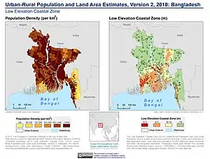 En raison du réchauffement climatique, le Bangladesh pourrait perdre 20 % de son territoire sous l'effet de la montée des eaux. En 2050, les « réfugiés climatiques » pourraient être 50 millions dans le pays[2].