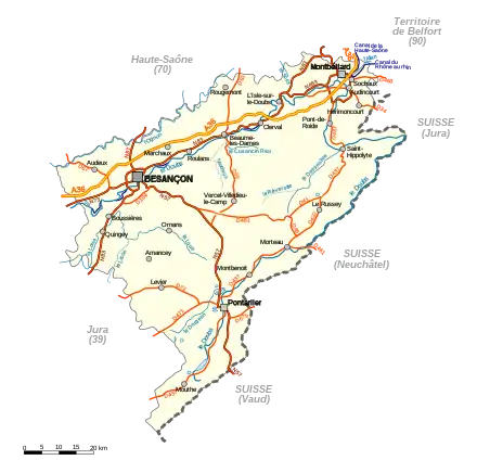On distingue généralement la partie basse du département (zone d’altitude inférieure à 500 mètres qui s’étend de Besançon à Montbéliard) et le Haut-Doubs (zone d’altitude supérieure à 500 mètres dont la capitale est Pontarlier) qui s’étire le long de la frontière suisse. La préfecture du département est Besançon.