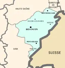 La géographie du Doubs présente une certaine singularité. Département français de taille modeste (5 234 km2, 69e rang national), il n’en présente pas moins une grande diversité de milieux naturels et de territoires. Il appartient à la région Bourgogne-Franche-Comté, dont il représente 11 % de la superficie et 19 % de la population. Il est bordé à l’ouest et au sud par le Jura, au nord par la Haute-Saône et le Territoire de Belfort, à l’est par la Suisse (cantons de Vaud, Neuchâtel et Jura) avec laquelle il possède 170 kilomètres de frontière. Les paysages du Doubs sont assez contrastés, avec de vastes plaines, des plateaux et massifs montagneux boisés, des vallées encaissées… Son point culminant est le mont d’Or (1 463 mètres).