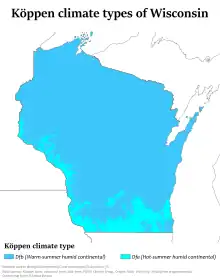 La majeure partie du Wisconsin est classée comme climat continental humide à été chaud (classification de Köppen Dfb), tandis que les parties sud et sud-ouest sont classées comme climat continental humide à été très chaud (Köppen Dfa). La température la plus élevée jamais enregistrée dans l'État était dans les Wisconsin Dells, le 13 juillet 1936, où elle a atteint 46 °C . La température la plus basse jamais enregistrée a été enregistrée dans le village du Couderay, où elle a atteint -48 °C les 2 et 4 février 1996[14].