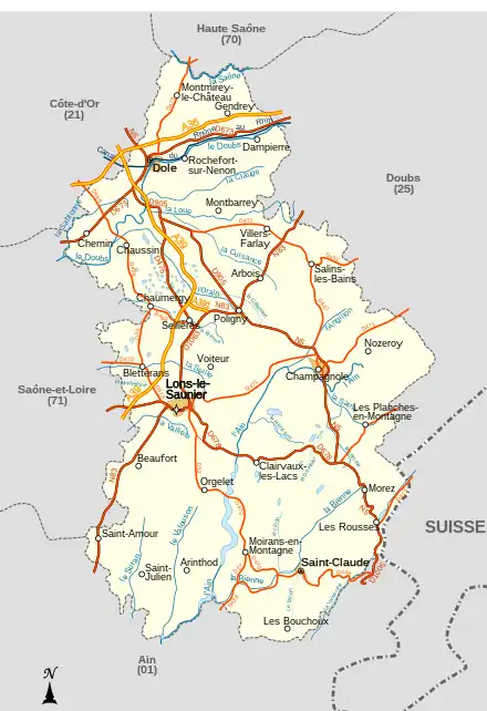 - Le Vignoble et Revermont : il longe le premier plateau du nord au sud, allant de Salins-les-Bains à Saint-Amour.