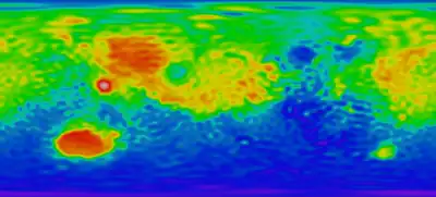 Champ de gravité martien déduit de la trajectoire de MGS. La carte est également tracée avec le méridien 0° sur le bord gauche, ce qui permet d'identifier d'un seul coup d'œil la contrepartie topographique des variations de gravité identifiées par la sonde. Les couleurs indiquent une gravité croissante du bleu au blanc en passant par le vert, le jaune et le rouge. On repère ainsi que le renflement de Tharsis, d'altitude très supérieure au niveau de référence martien, correspond à une anomalie de gravité positive, de même que le bassin d'Utopia Planitia, qui est pourtant d'altitude cette fois sensiblement inférieure au niveau de référence. A contrario, le sillon bleu marine apparaissant sous l'équateur à droite de la carte correspond à Valles Marineris, vaste fossé d'effondrement d'origine tectonique se traduisant par une « déchirure » de l'écorce et un défaut de masse localisé. |