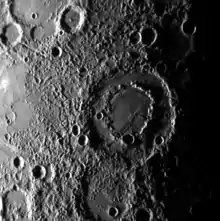 Les cratères de Mercure couvrent une large gamme de diamètres, de celui d'un petit bol jusqu'à celui d'une centaine de kilomètres de diamètre formant un bassin d'impact annelé. Ils apparaissent dans toute la gamme des états de dégradation possibles, certains sont relativement récents et d'autres ne sont que de très vieux restes de cratères complètement dégradés. Les cratères de Mercure diffèrent, dans les détails, des cratères lunaires - l'étendue de leurs couvertures d'éjectas est beaucoup plus petite, ce qui est une conséquence directe de la gravité de Mercure, 2,5 fois plus forte que celle de la Lune[3].