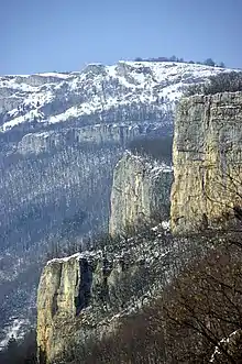 Les terrains du Crétacé, à dominante calcaire, sont préférentiellement préservés dans les synclinaux[a 13] de la Haute-Chaîne, le Salève et le Vuache où ils peuvent atteindre jusqu'à 200 m d'épaisseur. Globalement, le Crétacé est concentré dans le sud-ouest du Jura et disparaît à l'est de Bienne[56]. La majeure partie de la série du Crétacé inférieur (Berriasien-Barrémien) est relativement bien préservée à travers le domaine jurassien. Plusieurs étages du Crétacé inférieur ont ainsi été définis dans le canton de Neuchâtel : le Néocomien (Neuchâtel), le Valanginien (Valangin) et l'Hauterivien[57] (Hauterive). En revanche, les séries de l'Aptien au Turonien affleurent de manière plus restreinte, tandis que la majeure partie du Crétacé supérieur (Coniacien-Maastrichtien) est manquante[56].