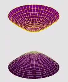 Plus généralement, l'ensemble des points à égale distance (spatio-temporelle) de A est un hyperboloïde, alors que dans le cas euclidien, l'ensemble des points à égale distance d'un centre définit une sphère.