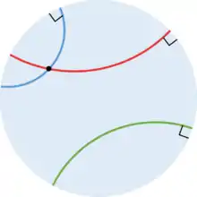 Alors on peut démontrer que le plus court chemin d’un point à un autre dans cette géométrie imaginaire est un arc de cercle perpendiculaire au cercle limite. Leurs droites à eux sont nos cercles à nous. Et vous voyez que dans leur géométrie, l’axiome d’Euclide n’est pas satisfait. La droite rouge est parallèle à la droite verte mais la droite bleue l’est également (deux droites qui ne se coupent pas sont en effet parallèles).