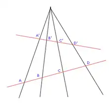 On appelle section d’un faisceau de droites de sommet O par une droite la correspondance qui associe à toute droite du faisceau son intersection avec la droite. La correspondance réciproque entre la droite ponctuelle et le faisceau est appelée projection de la droite ponctuelle à partir du point O.