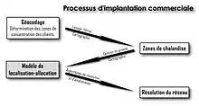 Les dernières avancées des modèles d'implantation commerciale associent un modèle de localisation-allocation (p-médian, p-centré, modèle quadratique…) avec des filtres de traitement du signal permettant une délimitation préalable de la zone de chalandise qui est la zone géographique concentrant la part essentielle de la clientèle. Ce type de modèle élaboré comporte 4 phases. La phase 1 de géocodage consiste à exploiter une base de données d'adresses de clients potentiels ou réels et à représenter ces localisations sur une carte. La représentation cartographique obtenue montre grossièrement les zones géographiques où se concentrent les clients par la forte densité des points s'y accumulant.