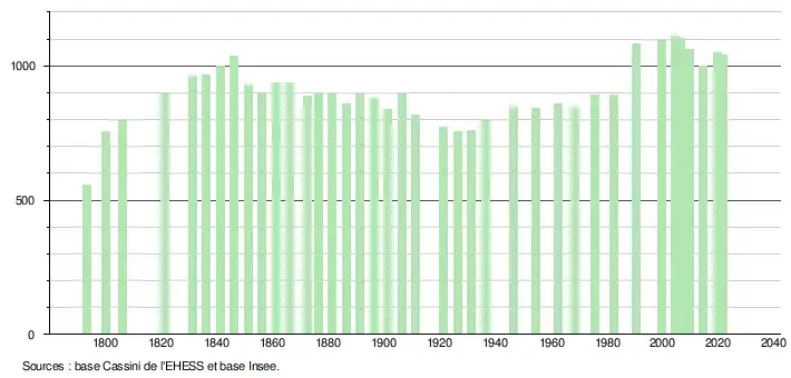 L'évolution du nombre d'habitants est connue à travers les recensements de la population effectués dans la commune depuis 1793. Pour les communes de moins de 10 000 habitants, une enquête de recensement portant sur toute la population est réalisée tous les cinq ans, les populations légales des années intermédiaires étant quant à elles estimées par interpolation ou extrapolation[21]. Pour la commune, le premier recensement exhaustif entrant dans le cadre du nouveau dispositif a été réalisé en 2004[22].
