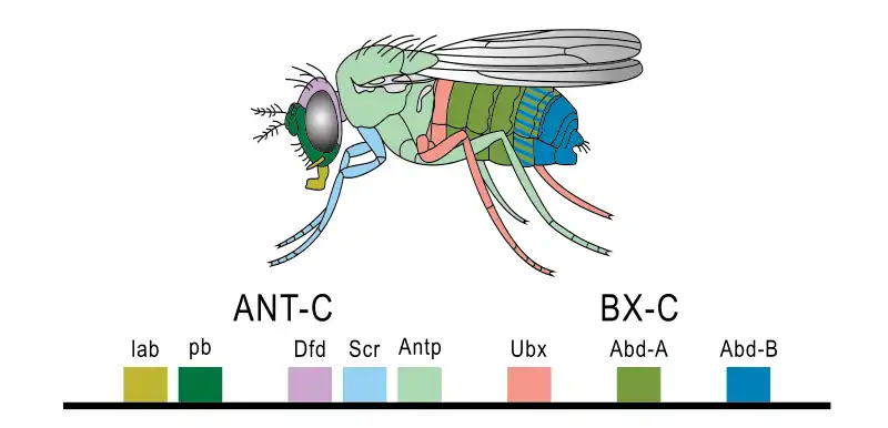 Les drosophiles sont des invertébrés qui possèdent huit gènes Hox organisés en deux complexes tous deux localisés sur le chromosome 3. Le premier complexe, antennapedia, est composé de cinq gènes : labial (lab), proboscipedia (pb), deformed (Dfd), sex combs reduced (Scr) et Antennapedia (Antp). Le deuxième complexe, bithorax, est composé de trois gènes : Ultrabithorax (Ubx), abdominal-A (abd-A) et abdominal-B (abd-B)[10].