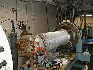 - Le système Van de Graaff Tandem (1958) ou l'accélérateur de particules permet de doubler l'énergie. Les particules sont accélérées deux fois de suite. Au milieu de l’appareil une feuille métallique très mince (ou un gaz) est traversée par les ions négatifs qui y perdent leurs électrons. Le changement de polarité permet une seconde accélération en revenant au potentiel du sol. La source et la cible de l’accélérateur sont au potentiel du sol, ce qui rend le maniement plus simple. Si la source engendre des ions positifs, ils sont transformés en ions négatifs avant accélération. Un accélérateur tandem à trois étages a fonctionné à Brookhaven, USA.