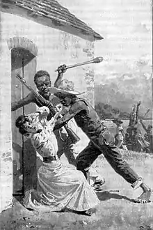 Illustration propagandiste allemande montrant une femme de colon agressée par des Noirs (avant 1904).