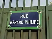 Un panneau Histoire de Paris lui rendant hommage est apposé au 17, rue de Tournon[3]. Par ailleurs, le nom de Gérard Philipe a été donné à de très nombreuses rues, théâtres, maisons de la culture et établissements d'enseignement français (écoles élémentaires et collèges).