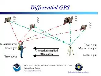 Le GPS différentiel (en anglais Differential Global Positioning System : DGPS) est une amélioration du GPS permettant de passer d'une précision de 15 mètres à 1-3 cm avec les meilleurs implémentations[1]. Il utilise un réseau de stations fixes de référence qui transmet l’écart entre les positions indiquées par les satellites et leurs positions réelles connues. En fait le récepteur reçoit la différence entre les pseudo-distances mesurées par les satellites et les véritables pseudo-distances et peut ainsi corriger ses mesures de positions.