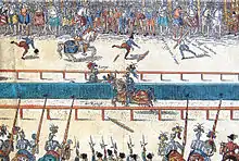 « Henri, qui voulut voiler l’ignominie du traité de Câteau-Cambresis, par splendeur des fêtes et la magnificence des noces de sa fille Élisabeth de France, avec Philippe II, Roi d’Espagne et celle de sa sœur Marguerite de France avec Emmanuel–Philibert, Duc de Savoye, ordonna un Tournoi Solemnel contre tous venans. Sa majesté, le Duc de Ferrare, le Duc de Guise, et M. de Nemours étaient les tenants.