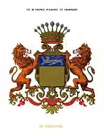 Coupé d'azur et d'or, « l'argent » [l'azur] parti à dextre du quartier des comtes sénateurs et chargé à sénestre d'un lion léopardé d'argent lampassé de gueules[16] |