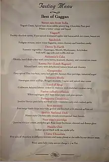 Autour d'une carte volumineuse, Gaggan sert des menus dégustation de 6, 10 et 15 plats. Il a créé en 2017 un menu de dégustation de 25 plats sans intitulés, seulement des emoji qu'Anand décrit comme « un moyen de transcender les barrières linguistiques »[6].