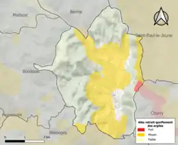 La commune est vulnérable au risque de mouvements de terrains constitué principalement du retrait-gonflement des sols argileux[30]. Cet aléa est susceptible d'engendrer des dommages importants aux bâtiments en cas d’alternance de périodes de sécheresse et de pluie. 40,7 % de la superficie communale est en aléa moyen ou fort (67,5 % au niveau départemental et 48,5 % au niveau national). Sur les 525 bâtiments dénombrés sur la commune en 2019, 337 sont en aléa moyen ou fort, soit 64 %, à comparer aux 90 % au niveau départemental et 54 % au niveau national. Une cartographie de l'exposition du territoire national au retrait gonflement des sols argileux est disponible sur le site du BRGM[31],[Carte 2].