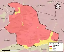 Le retrait-gonflement des sols argileux est susceptible d'engendrer des dommages importants aux bâtiments en cas d’alternance de périodes de sécheresse et de pluie. La totalité de la commune est en aléa moyen ou fort (75,2 % au niveau départemental et 48,5 % au niveau national). Sur les 102 bâtiments dénombrés sur la commune en 2019, 102 sont en aléa moyen ou fort, soit 100 %, à comparer aux 94 % au niveau départemental et 54 % au niveau national. Une cartographie de l'exposition du territoire national au retrait gonflement des sols argileux est disponible sur le site du BRGM[24],[Carte 3].
